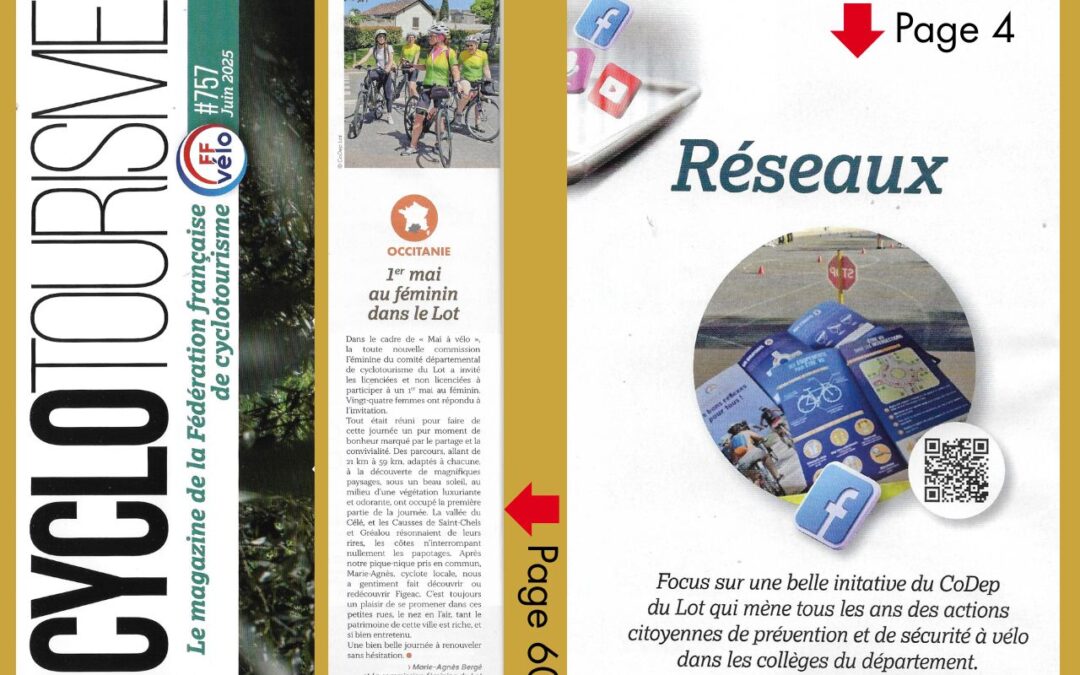 Les actions du comité départemental de cyclotourisme du Lot sont remarquées. La revue fédérale CYCLOTOURISME met en valeur l’action «Vélo – Collège» menée au printemps auprès des classes de sixième des collèges de Gourdon, Figeac Jeanne d’Arc et Bagnac sur Célé, au bénéfice de 170 collégien(ne)s dans sa rubrique « Sur les réseaux sociaux », page 4, ainsi que la journée «Premier mai au féminin», organisée par la commission féminines à Figeac, dans sa rubrique « Du côté de chez vous », page 60. Une belle reconnaissance pour l’engagement de nos bénévoles dans ces initiatives de promotion de la pratique du vélo à destination de tous les publics.