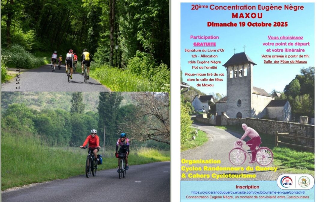 Voilà 20 ans que nous célébrons la disparition d’Eugène Nègre, fondateur du cyclotourisme lotois ; en 1951 d’abord en créant le premier club du Lot : les Cyclotouristes Cadurciens, puis 25 ans plus tard, en 1976, en créant le comité départemental de cyclotourisme FFCT. Le dirigeant que fut Eugène Nègre, n’est plus connu de la plupart des cyclos d’aujourd’hui. Néanmoins une poignée d’entre eux ont marqué son implication envers le cyclotourisme lotois en érigeant une stèle dans son village d’adoption en 2005, un an après sa disparition. Depuis cette année-là, avec l’aide de la municipalité de Maxou, se perpétue un rassemblement cyclotouriste qui se veut à la fois mémoriel, amical et convivial dans l’esprit qui anime cyclotouristes, et dirigeants du cyclotourisme lotois.