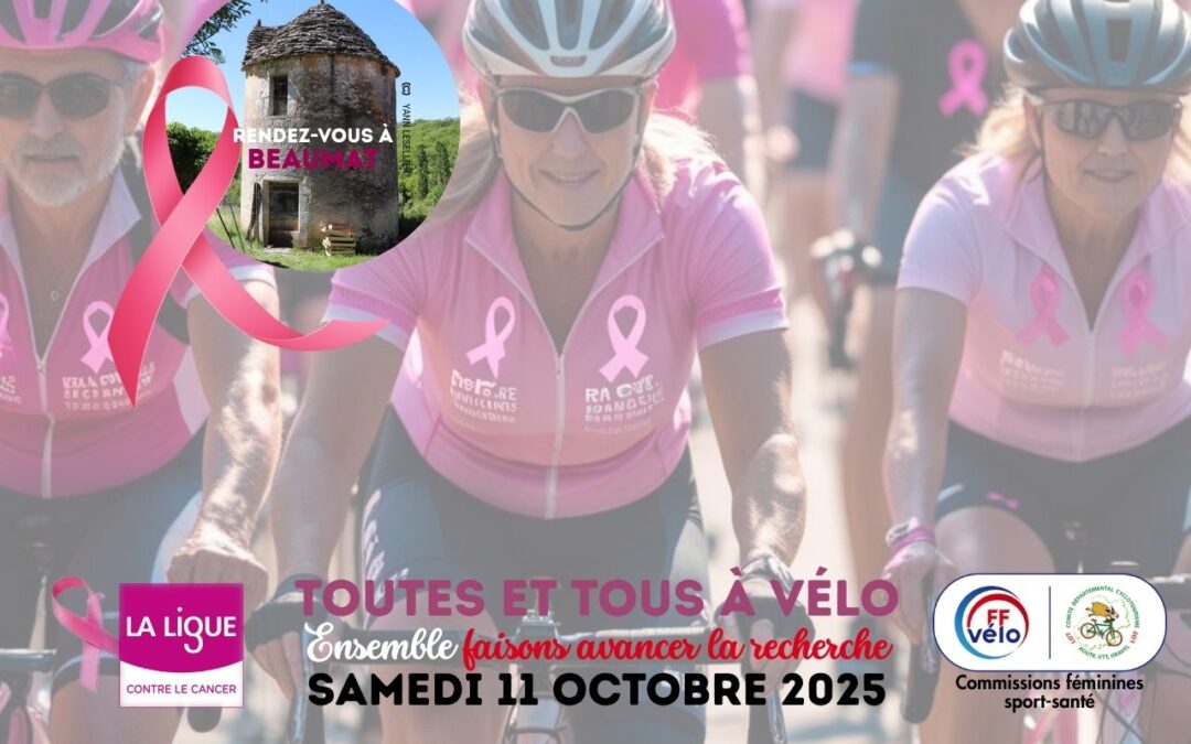 Samedi 11 octobre 2025, la commission féminine et la commission sport santé du comité de cyclotourisme du Lot vous donnent rendez-vous à la salle des fêtes de Beaumat à partir de 9h pour la deuxième édition d’« Octobre Rose à Vélo »,. Trois circuits route de 16, 25 et 43 km et deux circuits VTT de 10 et 20 km sont proposés pour découvrir à allure libre la beauté des environs. Départ à 9h30, après un café accompagné de petites douceurs pour accueillir les participant.e.s et pique-nique tiré du sac au retour.